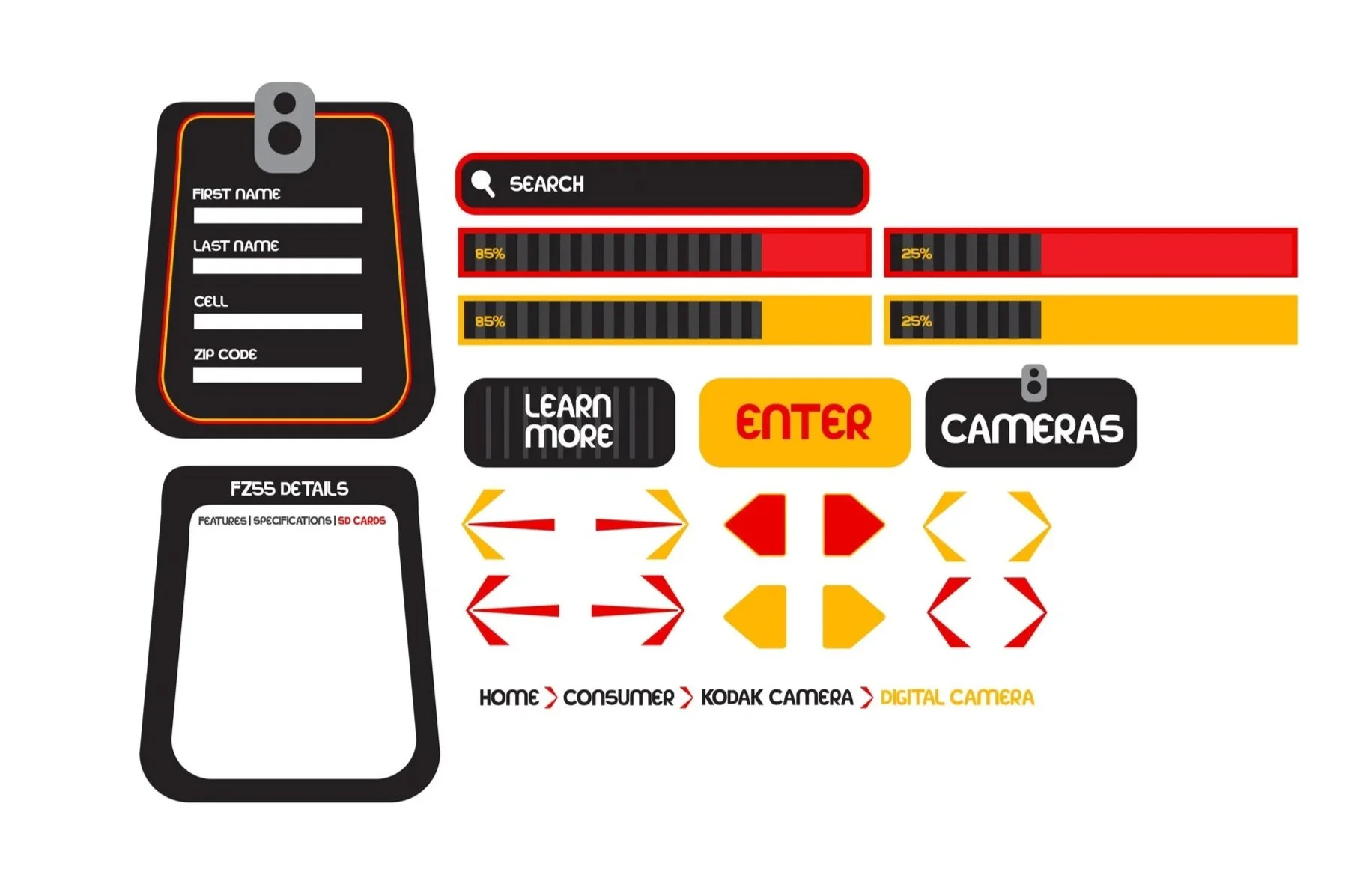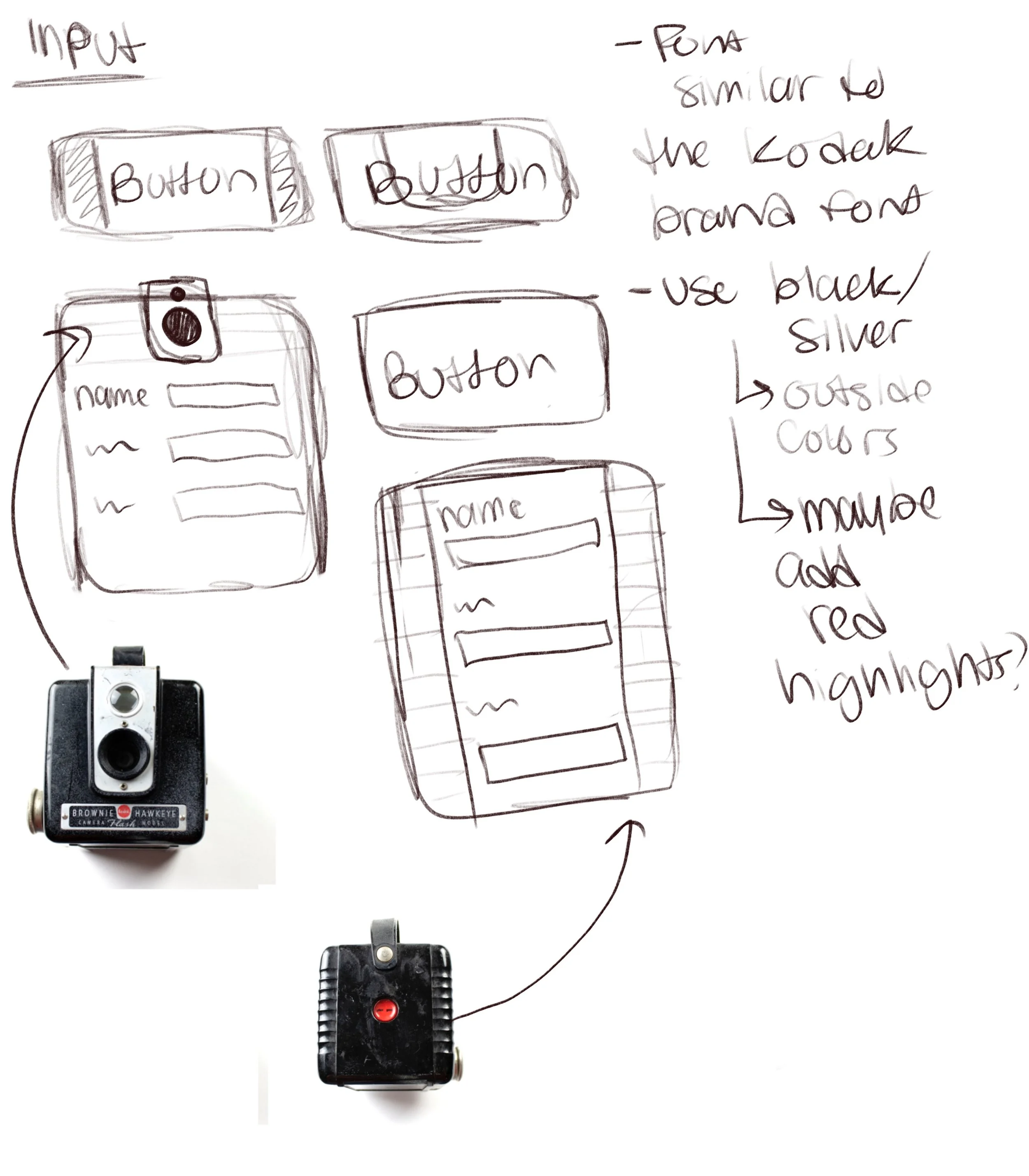 This assignment was to create various UI elements (input, output and helper) based on a retro item/brand. I chose the “Brownie Hawkeye Camera” created by Kodak as my inspiration due to my interest in photography. I chose to have some elements mimic the camera in both shape and texture. The two elements on the left have a similar shape to the camera while the loading bars mimic the grooved texture on the side of the camera. For colors I chose to use the colors from the Kodak logo to help associate the brand with the camera. That is the same reason why I decided to use the Kodak font.